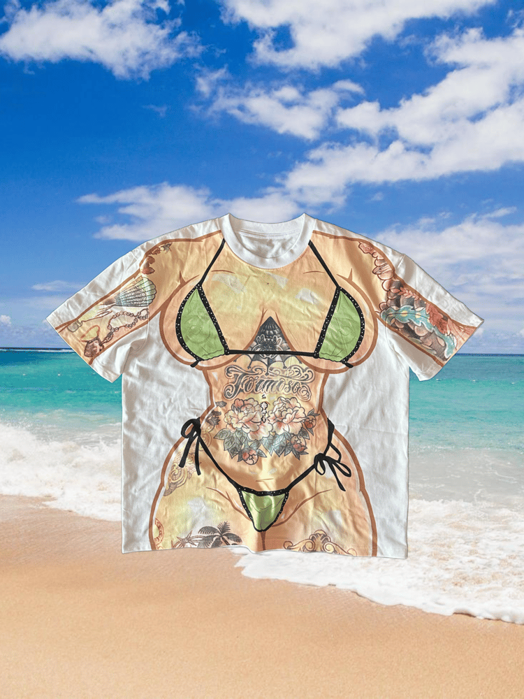 be beach-body ready any time with the connie perignon ‘bimbo body’ tshirt! designed by @terryalec, this original design fake bikini shirt took 7 months of tinkering to produce and perfect. this shirt is guaranteed to start conversations!